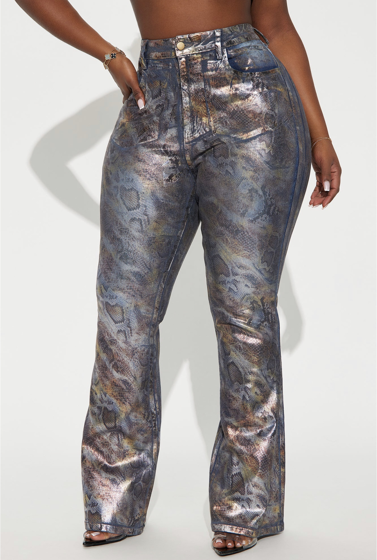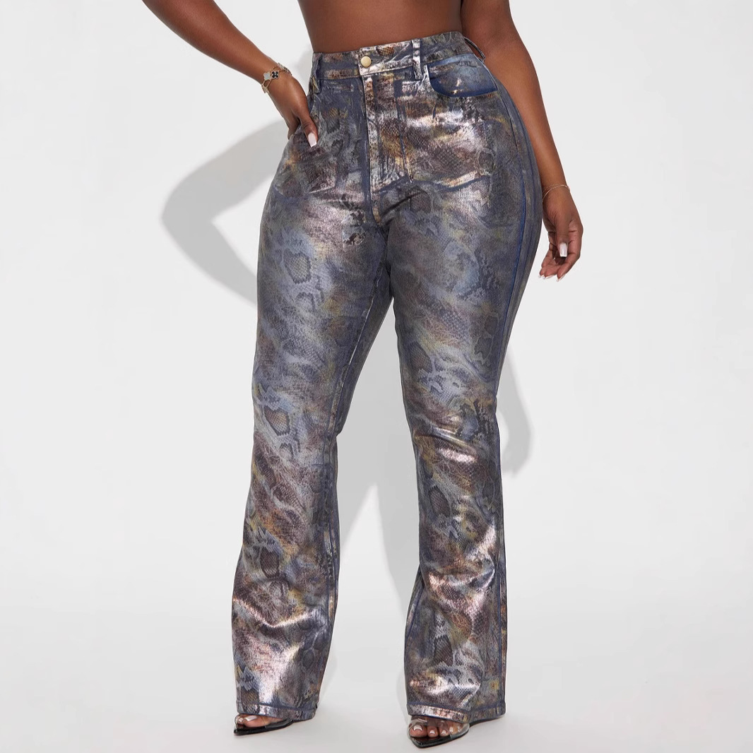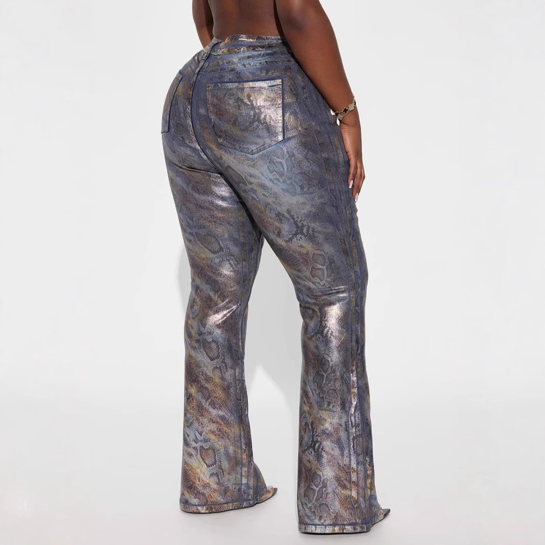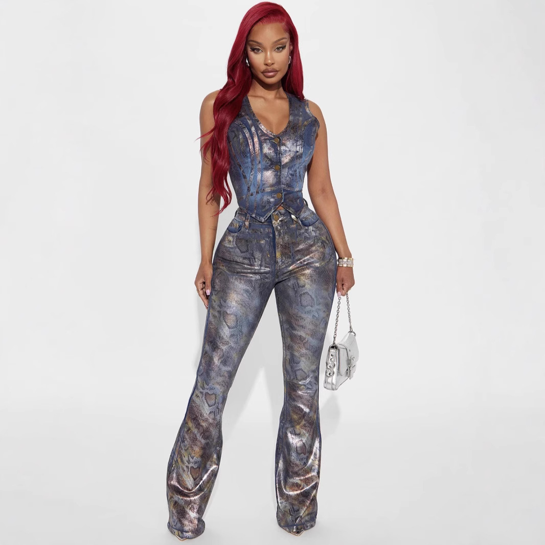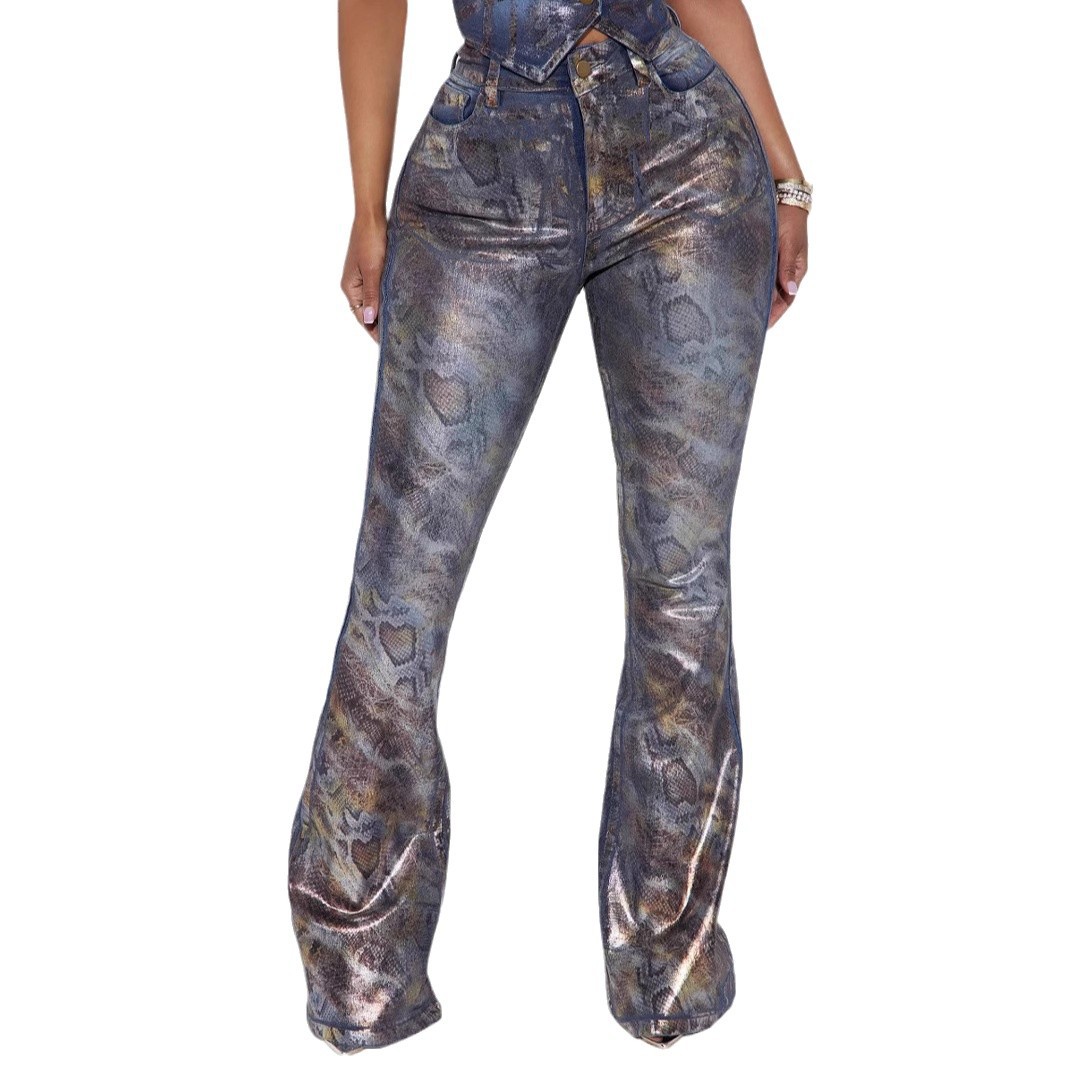 Strapless Trousers: Unique strapless design paired with stylish printed jeans.